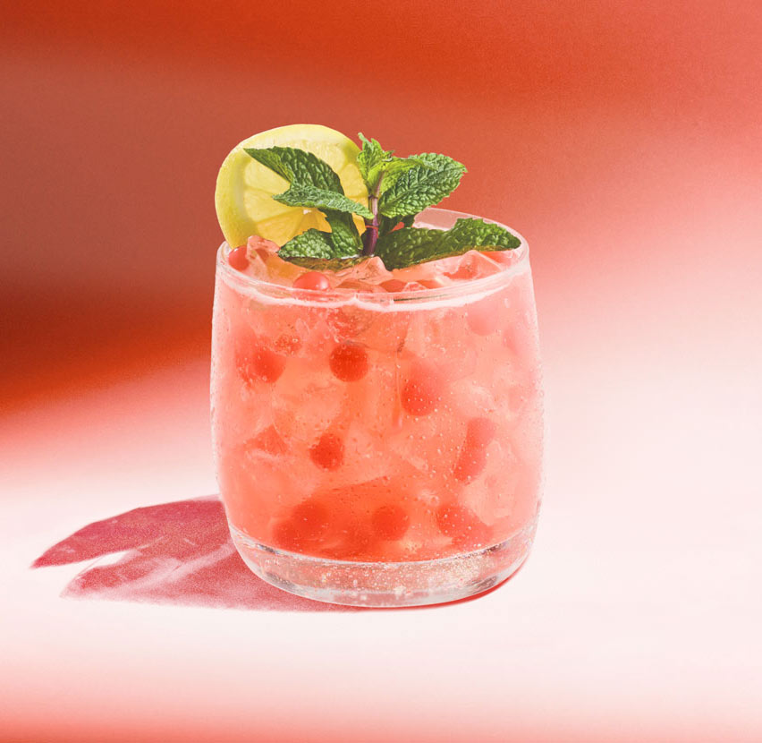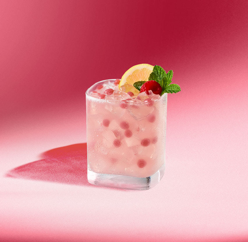 Method:Measure all ingredients (20-30 Boba POPS). Muddle. Shake over ice. Strain into a lowball glass over fresh ice. Garnish with a mint sprig, raspberry, a lemon wedge, and 10-15 Boba POPS.