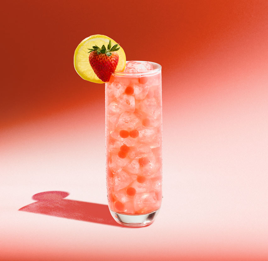 Method:Shake all ingredients except Boba POPS. Strain into a tall rocks glass over fresh ice. Garnish with 1 serving Boba POPS, a lemon wheel, and an upward cut strawberry.