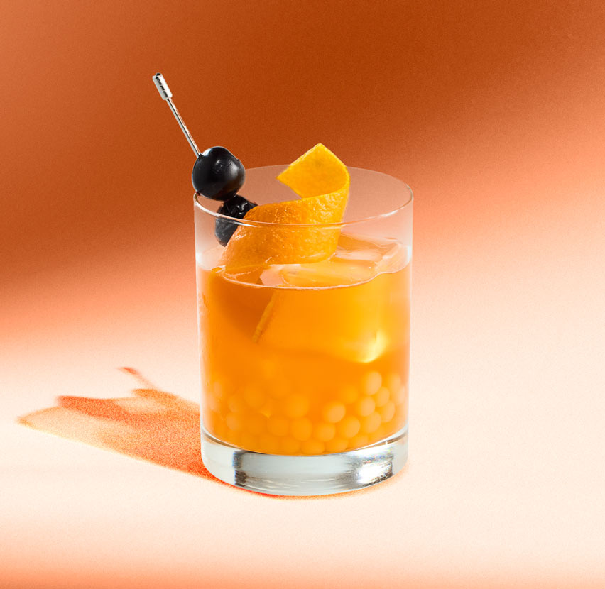 Method:Stir all ingredients except Boba POPS over ice. Strain into a lowball glass over a large ice cube. Garnish by dropping 1 serving Peach Boba POPS into the glass, orange twist, and Luxardo cherry.