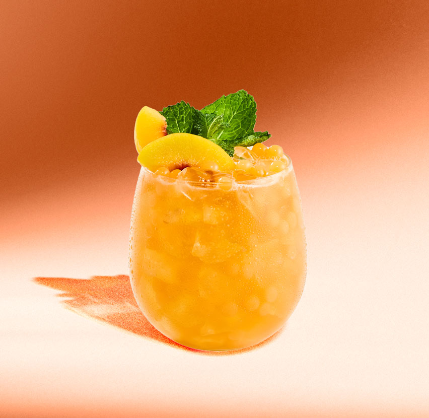 Method: Measure all ingredients (20-30 Boba POPS). Muddle. Shake over ice. Strain into a lowball glass over fresh ice. Garnish with a mint sprig, a peach sliver, and 10-15 Boba POPS.