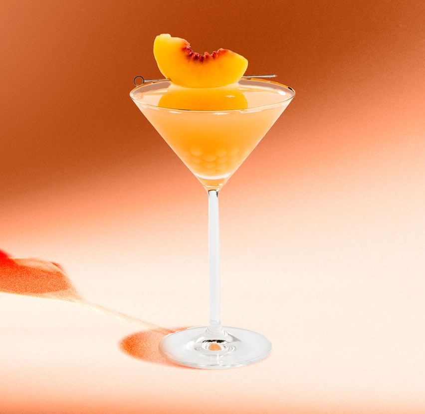 Method:Shake over ice. Strain into a martini glass. Garnish with dropping 1 serving Peach Boba POPS and a fresh peach skewer.